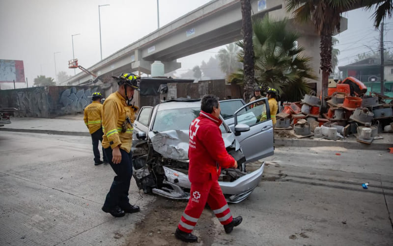 TIJUANA, NOVIEMBRE 9, 2025.- Un vehículo tipo sedán, marca Honda, terminó con pérdida total luego de impactarse contra el muro que sostiene la estructura del viaducto elevado, sobre la Avenida Internacional, a la altura del edificio del Partido Revolucionario Institucional (PRI). Los hechos ocurrieron la mañana de este domingo