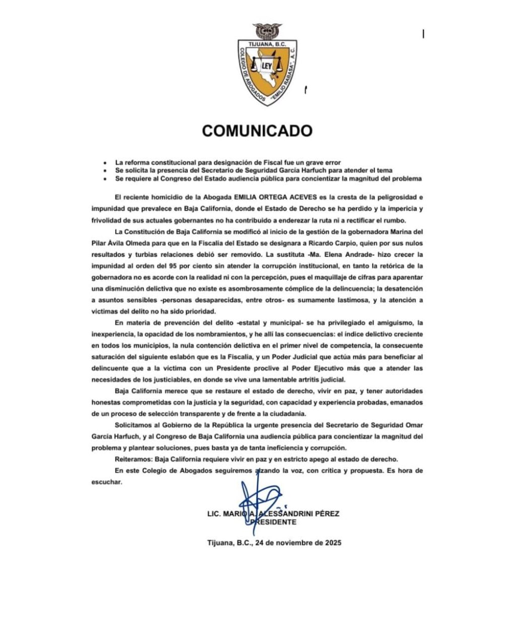 TIJUANA, NOVIEMBRE 23, 2025.- El Colegio de Abogados de Tijuana lanzó un fuerte posicionamiento público tras el homicidio de la abogada Emilia Ortega Aceves, afirmando que el crimen refleja “la cresta de la peligrosidad e impunidad” que prevalece en Baja California, y responsabilizando a las autoridades estatales por lo que califican como un grave deterioro del Estado de Derecho.