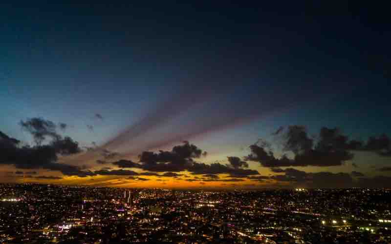 Las imágenes captadas desde el aire muestran un entorno urbano donde la despedida del sol tiñó el cielo de naranjas, rosas y dorados, mientras poco a poco comenzaron a encenderse las luces nocturnas de la ciudad fronteriza, creando un contraste entre el ocaso.