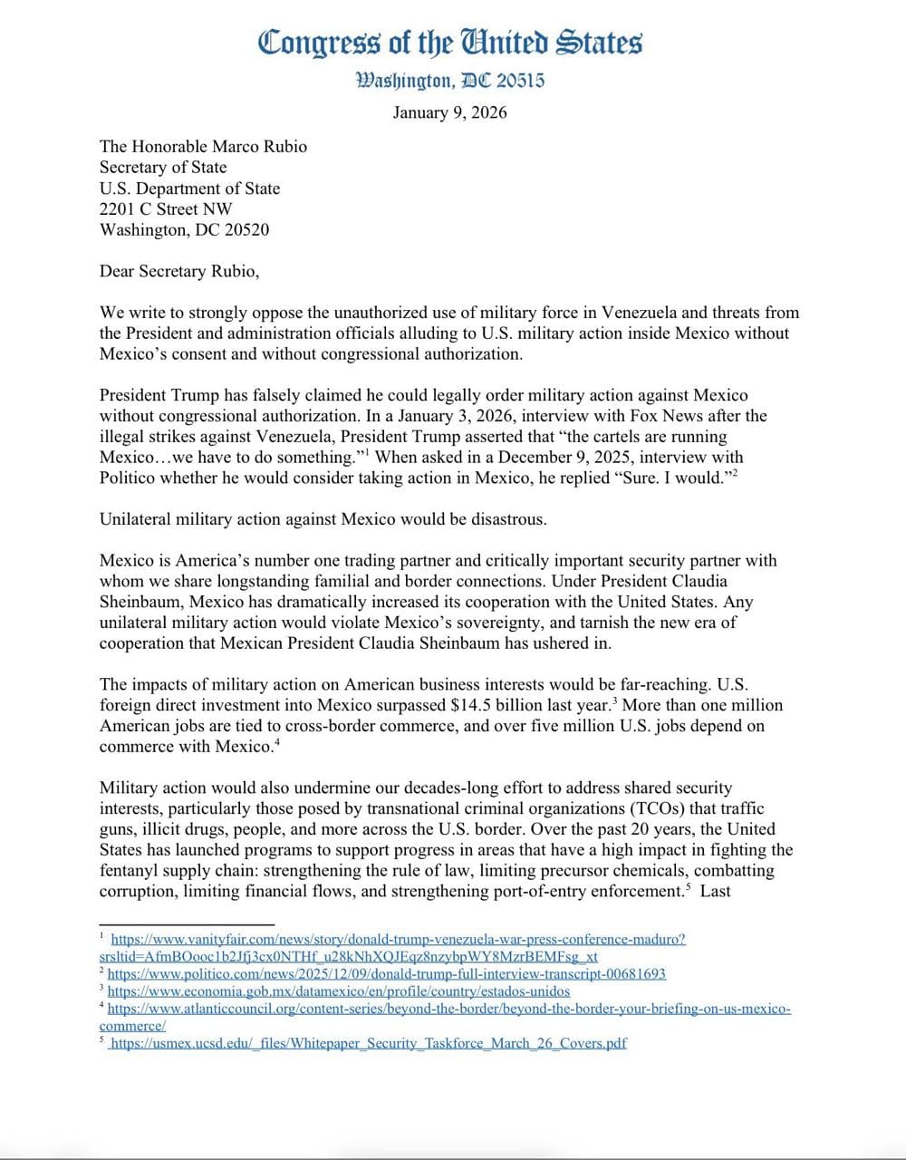 TIJUANA, ENERO 14, 2026.- Un grupo de 72 congresistas del Partido Demócrata envió una carta oficial a autoridades del gobierno de Estados Unidos en la que rechazan de manera tajante cualquier acción militar unilateral contra México, particularmente una intervención terrestre, al advertir que sería ilegal, inconstitucional y altamente perjudicial para la relación bilateral.