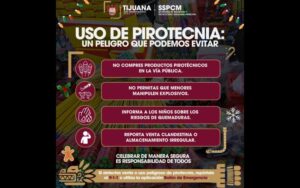 TIJUANA, DICIEMBRE 24, 2025.- Con motivo de las fiestas navideñas, la Secretaría de Seguridad y Protección Ciudadana Municipal (SSPCM) hizo un llamado a la ciudadanía a celebrar de manera responsable y segura, evitando el uso de pirotecnia y los disparos al aire, prácticas que cada año ocasionan lesiones graves, incendios y pérdidas irreparables.