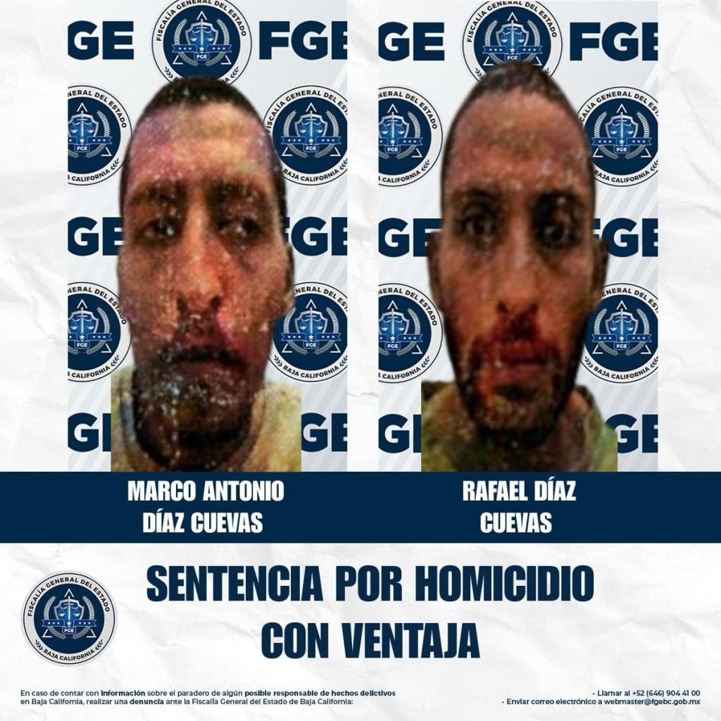 TIJUANA, NOVIEMBRE 9, 2025.- La Fiscalía Regional de Tijuana, a través de la Coordinación de Averiguaciones Previas y Control de Proceso, logró que fueran sentenciados Marco Antonio Díaz Cuevas, alias “El Malo”, y Rafael Díaz Cuevas, alias “El Primo”, a 23 años y nueve meses de prisión, luego de que se acreditó su responsabilidad en el delito de homicidio calificado con ventaja.