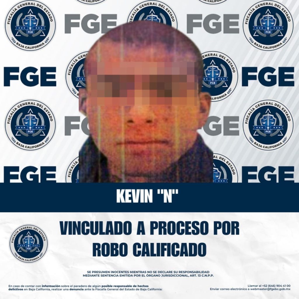TIJUANA, NOVIEMBRE 9, 2025.- La Fiscalía General del Estado, a través de la Fiscalía Regional de Tijuana y la Unidad de Investigación de Robos Mariano Matamoros, logró que un juez de control vinculara a proceso a Kevin “N” por el delito de robo calificado cometido en establecimiento comercial abierto al público, ejecutado con violencia, en perjuicio de una cadena comercial Oxxo.