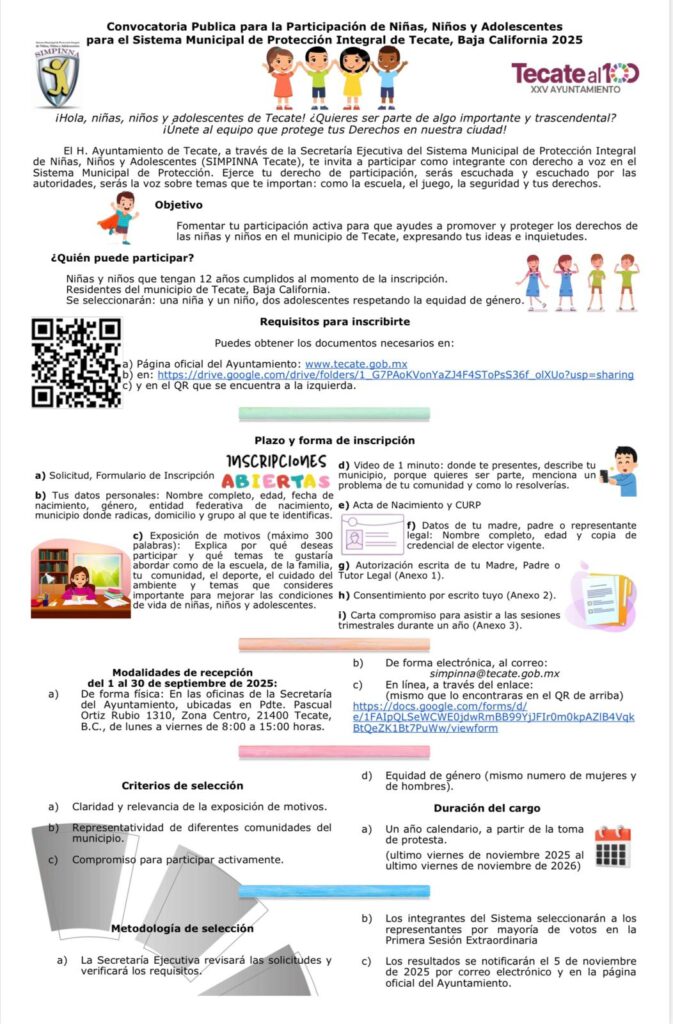 TECATE, SEPTIEMBRE 18, 2025.– El Gobierno de Tecate, a través de la Secretaría Ejecutiva del Sistema Municipal de Protección Integral de Niñas, Niños y Adolescentes (SIPINNA Tecate), invita a participar en la Convocatoria Pública 2025 para integrar el equipo que promueve y protege los derechos de la niñez y adolescencia en el municipio.