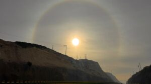 TIJUANA, DICIEMBRE 22, 2025.- Un fenómeno natural conocido como halo solar sorprendió a habitantes de Tijuana, al observarse una circunferencia de colores similar a un arcoíris alrededor del Sol.