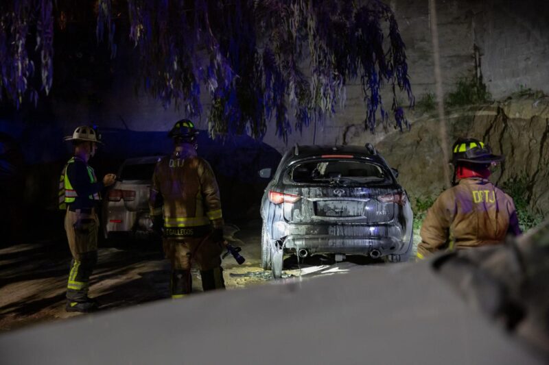 TIJUANA, DICIEMBRE 19, 2025.- Dos vehículos fueron incendiados en un terreno baldío de la colonia La Cima, causando alarma entre los vecinos de la zona.