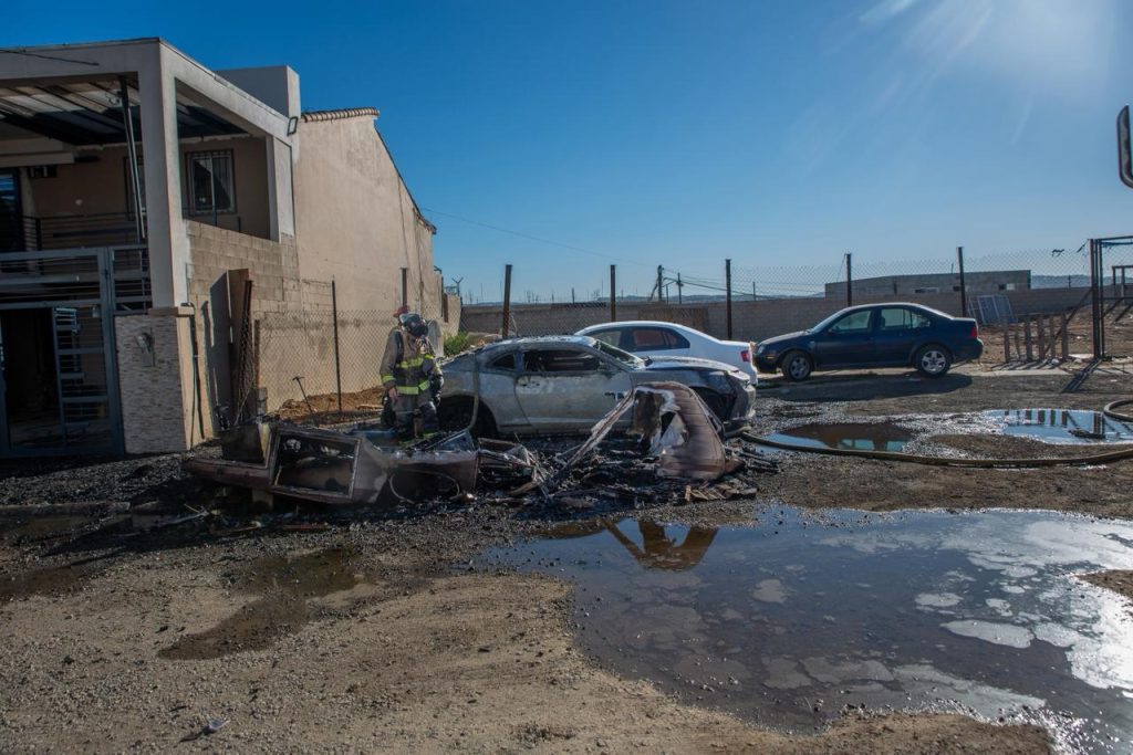 TIJUANA, OCTUBRE 29, 2025.-Un “motor home” y un auto Camaro negro con placas nacionales fueron consumidos por fuego esta tarde en la colonia Indeco Universidad.