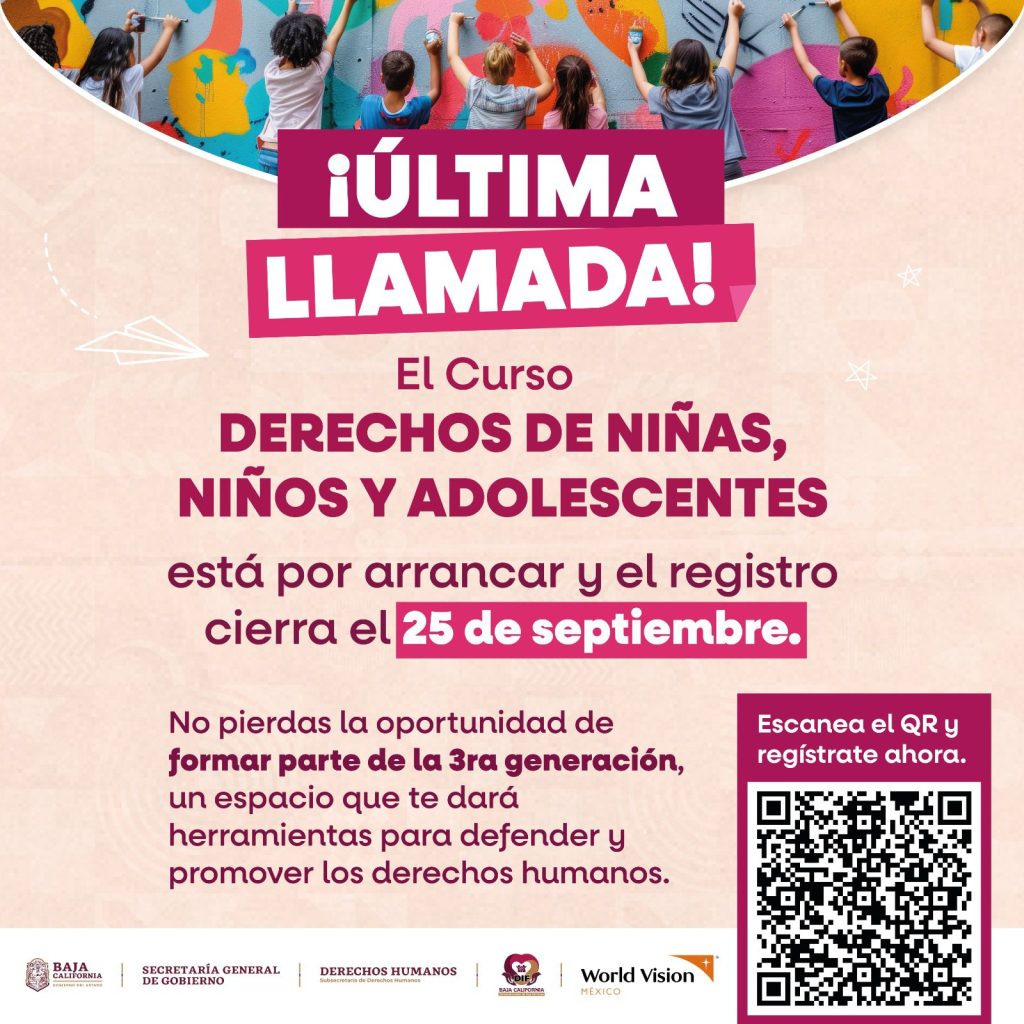 TIJUANA, SEPTIEMBRE 23, 2025.– El Gobierno del Estado de Baja California, encabezado por la Gobernadora Marina del Pilar Avila Olmeda, a través de la Secretaría General de Gobierno, convoca a la ciudadanía a aprovechar los últimos días de registro para participar en la tercera generación del curso “Derechos de Niñas, Niños y Adolescentes”.