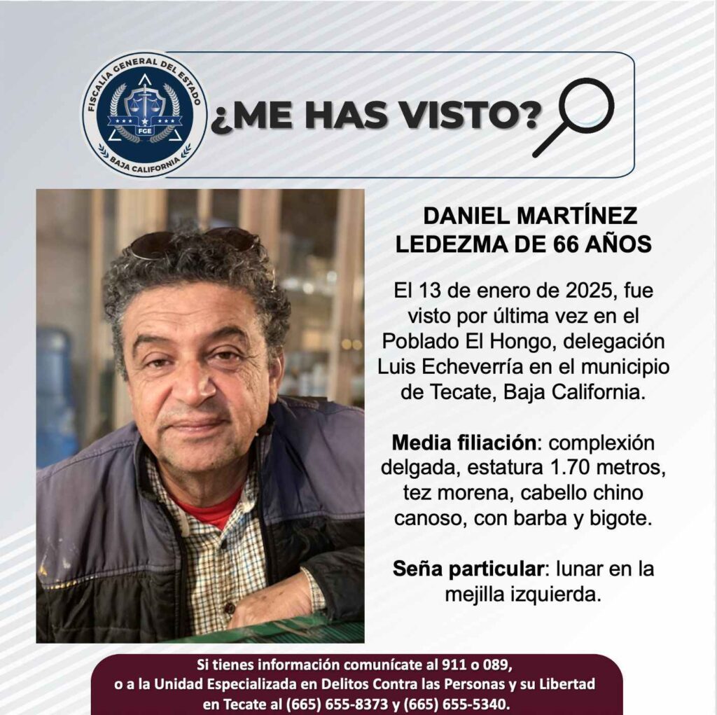 TECATE, ENERO 20, 2026.- La Fiscalía General del Estado, solicita el apoyo de la ciudadanía para localizar a Daniel Martínez Ledezma de 66 años de edad.