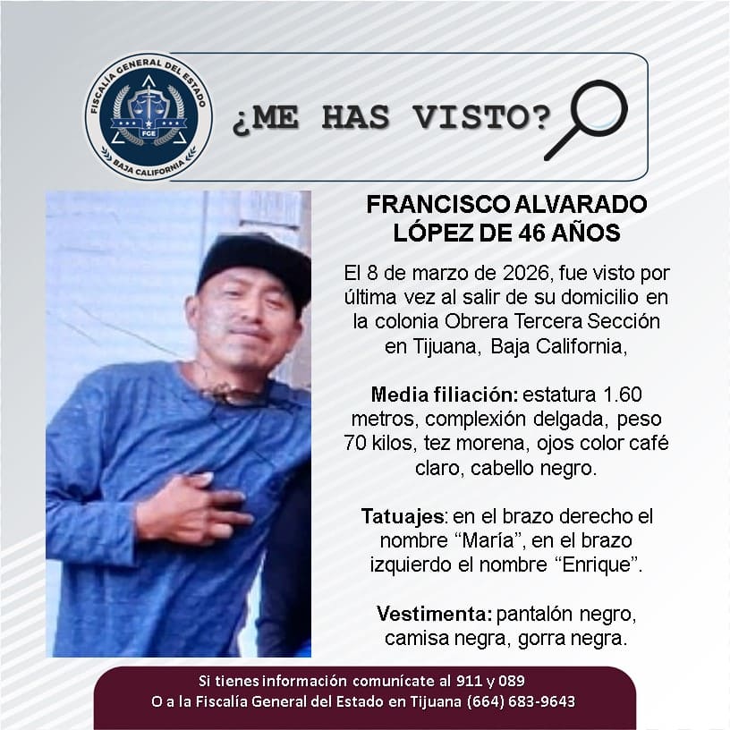 TIJUANA, MARZO 15, 2026.- La Fiscalía General del Estado (FGE), solicita el apoyo de la ciudadanía para localizar a Francisco Alvarado López de 46 años de edad.