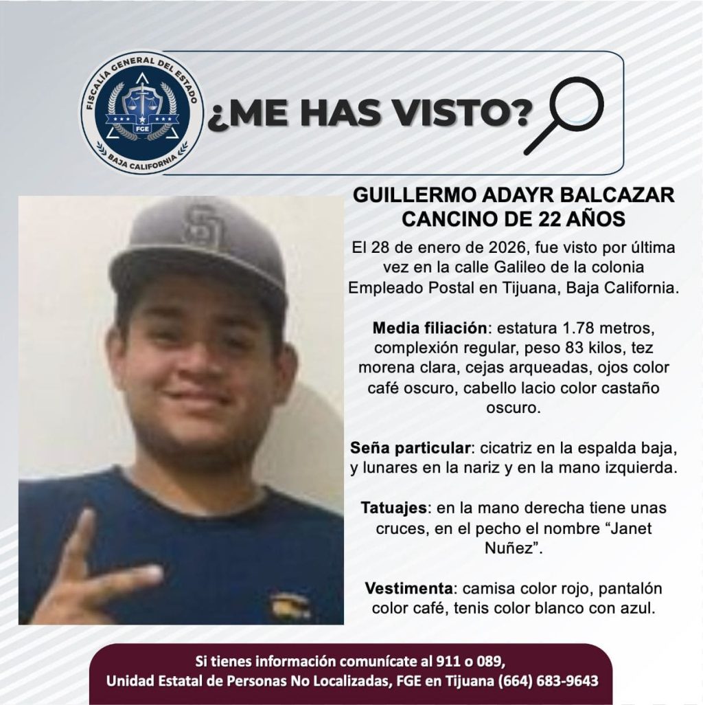 TIJUANA, FEBRERO 3, 2026.- La Fiscalía General del Estado (FGE), solicita el apoyo de la ciudadanía para localizar a Guillermo Adayr Balcazar Cancino de 22 años de edad.