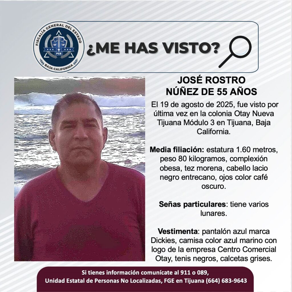 TIJUANA, SEPTIEMBRE 17, 2025.- La Fiscalía General del Estado (FGE), solicita el apoyo de la ciudadanía para localizar a José Rostro Núñez de 55 años de edad.