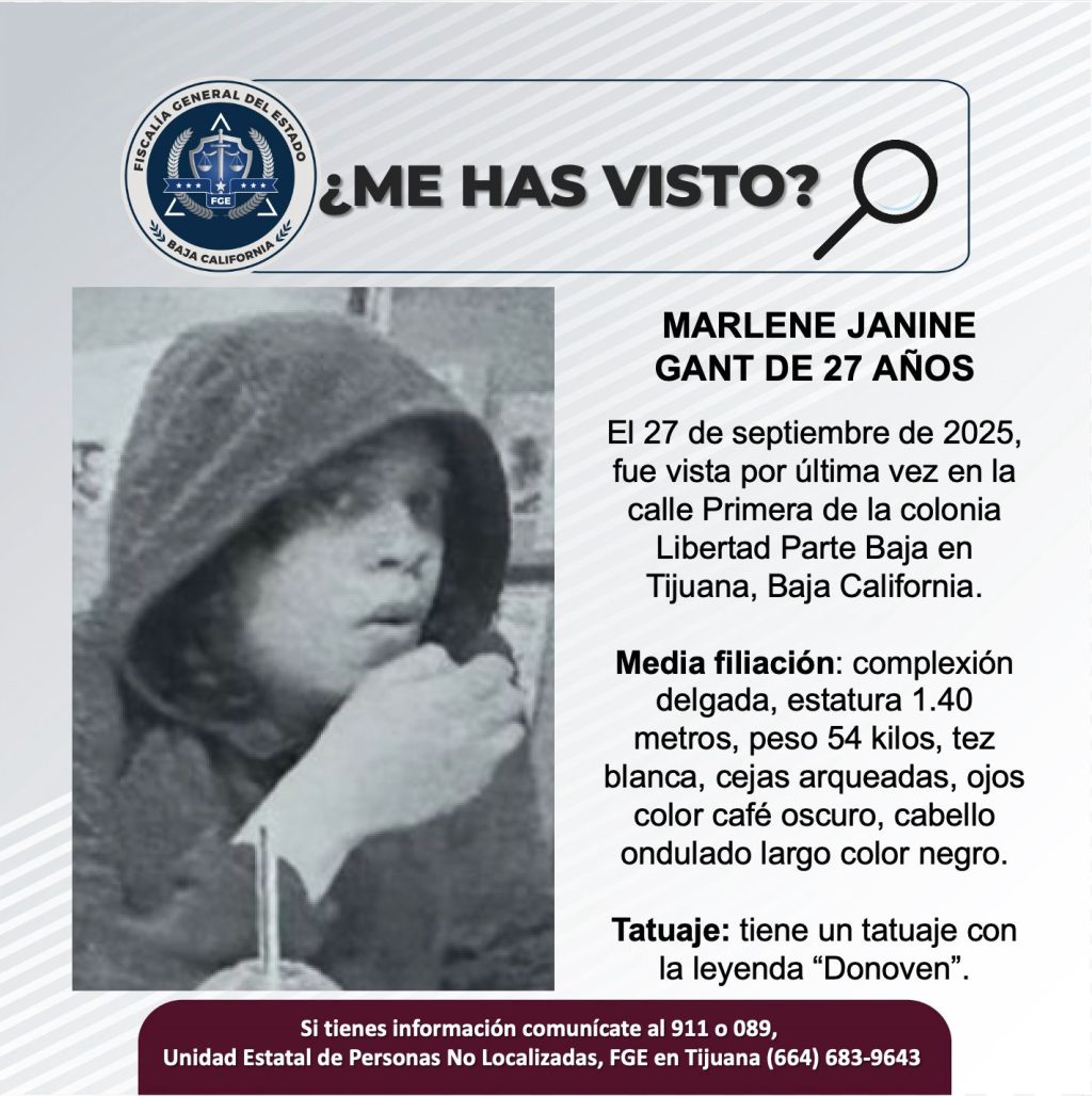 TIJUANA, OCTUBRE 13, 2025.- La Fiscalía General del Estado (FGE), solicita el apoyo de la ciudadanía para localizar a Marlene Janine Gant de 27 años de edad.