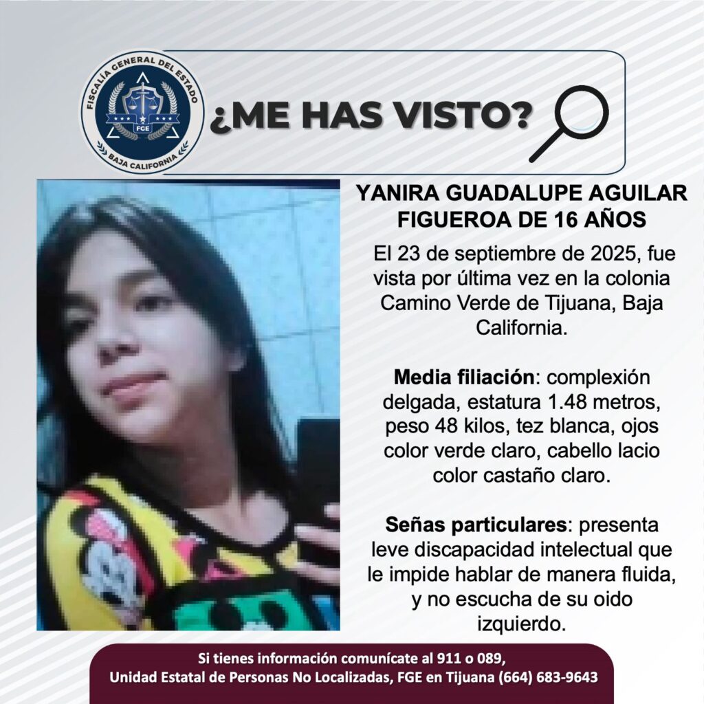 TIJUANA, SEPTIEMBRE 24, 2025.- La Fiscalía General del Estado (FGE), solicita el apoyo de la ciudadanía para localizar a Yanira Guadalupe Aguilar Figueroa de 16 años de edad.