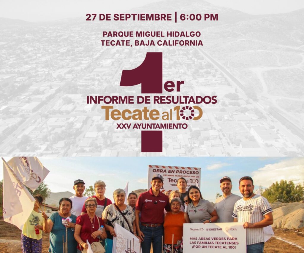 TECATE, SEPTIEMBRE 25, 2025.– Este sábado 27 de septiembre a las 6:00 de la tarde, el alcalde Román Cota Muñoz rendirá cuentas al pueblo de Tecate con su Primer Informe de Resultados, en un acto público que tendrá lugar frente al Parque Miguel Hidalgo, corazón del municipio.