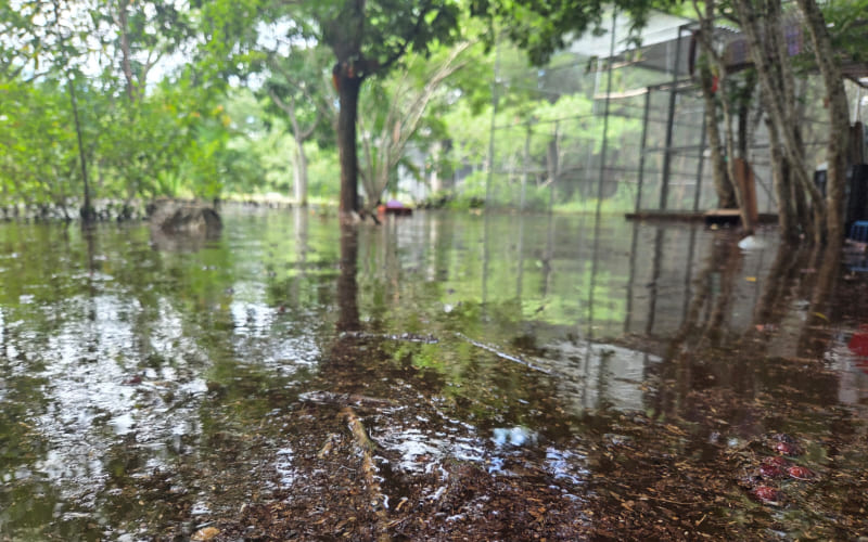 MÉRIDA, YUCATÁN, SEPTIEMBRE 22, 2025.- Las intensas lluvias en todo el Estado dejaron el refugio de loros de Proyecto Santa María como zona de desastre. Todo el terreno se encuentra inundado con unos 50 cm de agua.